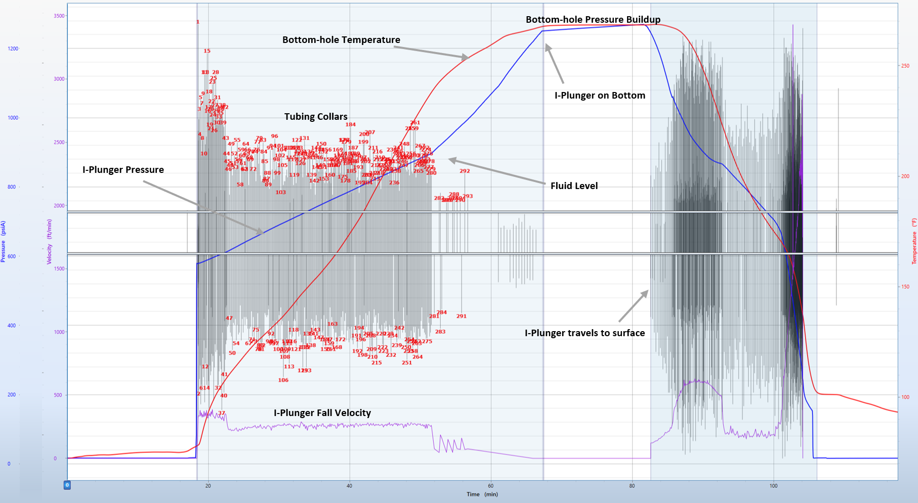 The I-Plunger allows producers to easily acquire downhole data that is critical in optimizing plunger lift and gas lift wells. Anomalies are pinpointed by using highly sensitive pressure and temperature transducers. An on board collar locator provides plunger location and velocity as it travels through the wellbore. Frequently diagnosed data sets include holes in the tubing, gas lift valve malfunction, short tripping plungers, wellbore stall points, worn and corroded tubing, fluid levels, and plunger fall/rise velocities.